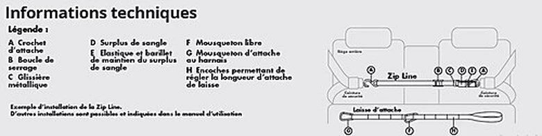 La tyrolienne est réglable pour s’adapter à tous les formats de voiture et est fournie avec une laisse d’attache qui se fixe au harnais du chien et qui peut également être utilisée comme laisse de promenade