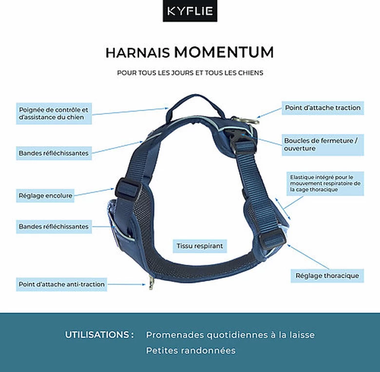 Le harnais MOMENTUM de KYFLIE est un harnais de chien multifonction pour la promenade quotidienne et les activités plein air. Pouvant remplacer le collier, surtout pour les chiens qui tirent en laisse, ce harnais respecte les formes anatomiques du chien au niveau du cou et de la colonne vertébrale sans les endommager. Sa mise en place par l’encolure du chien est facile et rapide, le réglage au niveau de l’encolure et la cage thoracique permet un ajustement optimum sur le chien.