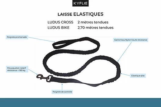 La laisse LUDUS CROSS de KYFLIE est une laisse élastique antichocs pour chien conçue pour la pratique du cani-cross et la promenade. Sa structure élastique sur toute la longueur de la laisse amortit progressivement les chocs de la traction du chien, apportant ainsi un maximum de confort pendant l’effort autant pour le dos du chien et que pour son accompagnateur.