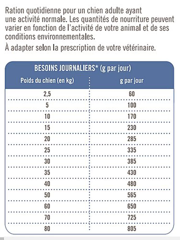 | Conseils d'utilisation | Il est recommandé de consulter un vétérinaire avant utilisation ou prolongation de la période d'utilisation. La durée d'utilisation est de 3 mois. À distribuer sec en respectant les rations journalières conseillées et indiquées ci-dessous. Tenir en permanence à sa disposition de l'eau fraîche et propre. À conserver dans un endroit frais et sec. |