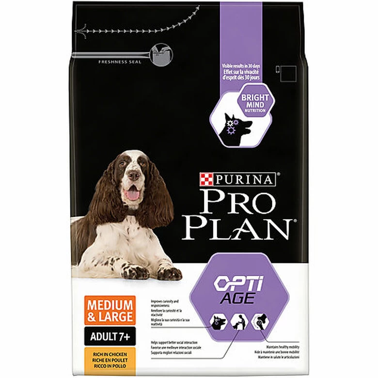 PURINA PRO PLAN avec OPTIAGE(TM) aide votre chien à garder un poids de forme et contient des triglycérides à chaîne moyenne (TCM 5,5%), prouvés pour aider à garder l’esprit des chiens vif et alerte.