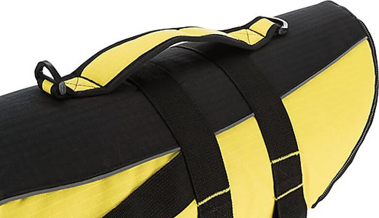Gilet de sauvetage pour chien jaune/noir avec une sécurité renforcée pour l’entraînement et le jeu dans l’eau et pour les sorties en bateau. Gilet avec un maintien ferme grâce aux bandes auto-agrippantes et sangles en nylon avec fermetures à clic.