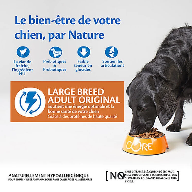Les croquettes Wellness CORE Original Grande Race contiennent de la dinde fraîche en premier ingrédient. Elles sont aussi composées de chondroïtine et de glucosamine qui soutiennent le fonctionnement des articulations.