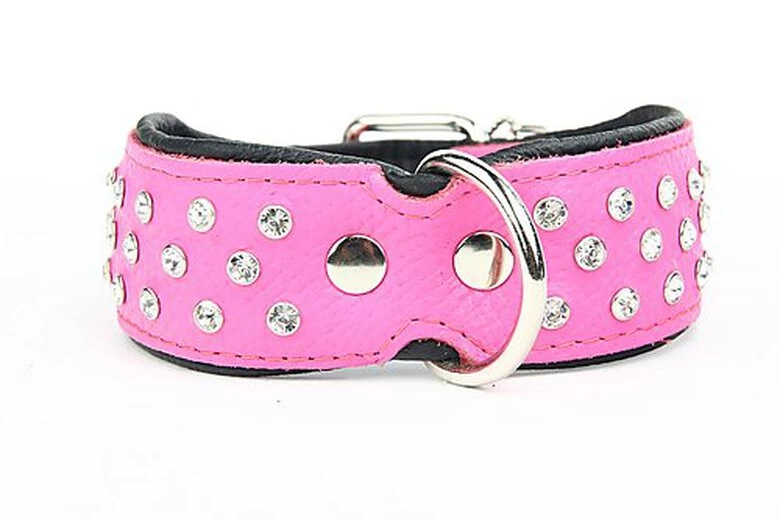 Collier décoré de cristaux fait de cuir véritable sur le dessus et de cuir nappa véritable de haute qualité et souple sur le dessous. Anneau en D solide et soudé.