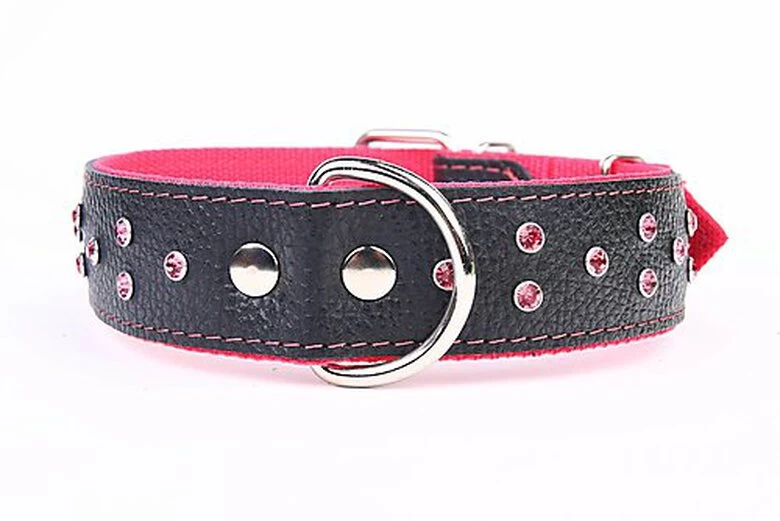 Collier de haute qualité en cuir véritable, ruban en nylon coloré et strass pour chien. Chaque collier comprend un anneau en D solide et soudé. Les matières premières utilisées pour la production proviennent de fournisseurs européens.